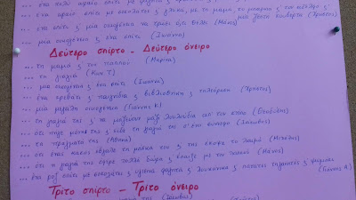 Μία από τις πρώτες εργασίες που ζήτησαν τα παιδιά ήταν να φτιάξουμε κολάζ χιονανθρώπων. Αμέσως μετά διαβάσαμε το κλασσικό παραμύθι του Χανς Κρίστιαν Άντερσεν "Το κοριτσάκι με τα σπίρτα." Όμως αντί να εστιάσουμε στις ιδέες του μεγάλου παραμυθά, βάλαμε τη φαντασία μας να δουλέψει και κάναμε τις δικές μας προτάσεις σχετικά με το τι βλέπει το κοριτσάκι κάθε φορά που ανάβει τα σπίρτα του... Οι ιδέες αυτές μάλιστα απετέλεσαν και τη βάση της θεατρικής διασκευής που παρουσιάσαμε στη Χριστουγεννιάτικη γιορτή μας.